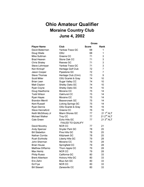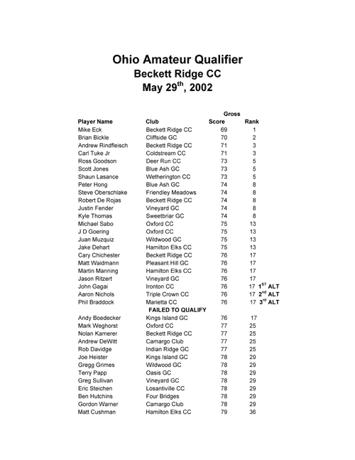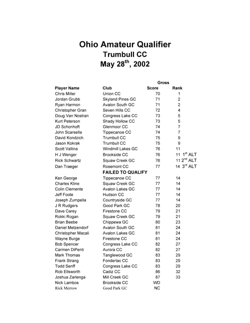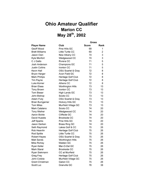 The 2002 OGA Ohio AM Qualifier was a one day tournament held at Marion Country Club in Marion, OH.